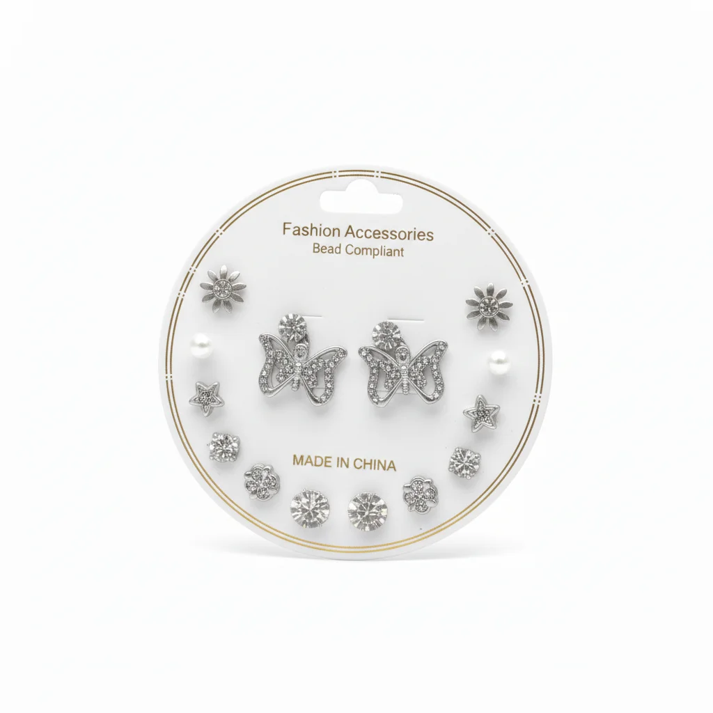 • طقم يضم عدة أزواج من الحلقان الصغيرة بتصميمات مختلفة مثل الفراشة والنجمة والزهرة واللؤلؤ.
