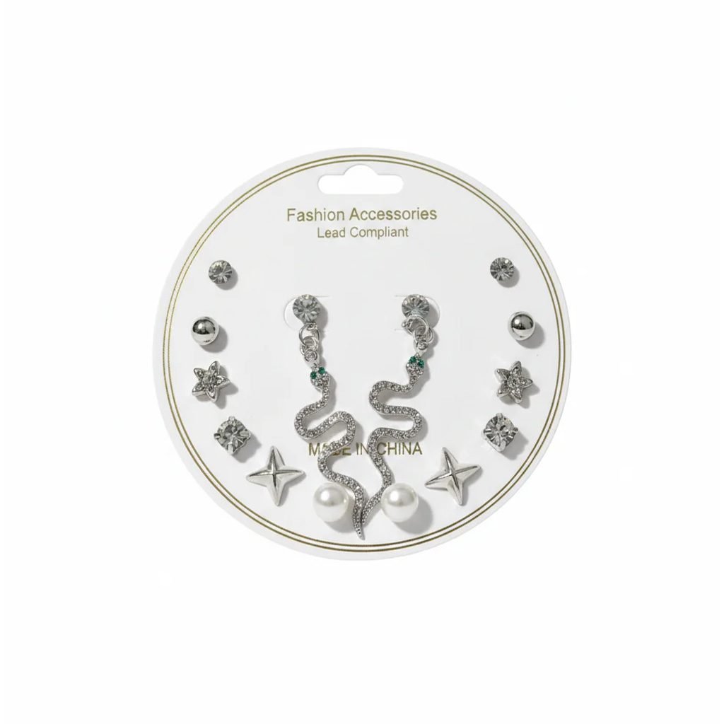 • طقم يضم عدة أزواج من الحلقان بأشكال مختلفة مثل النجمة والحجر واللؤلؤ والثعبان.